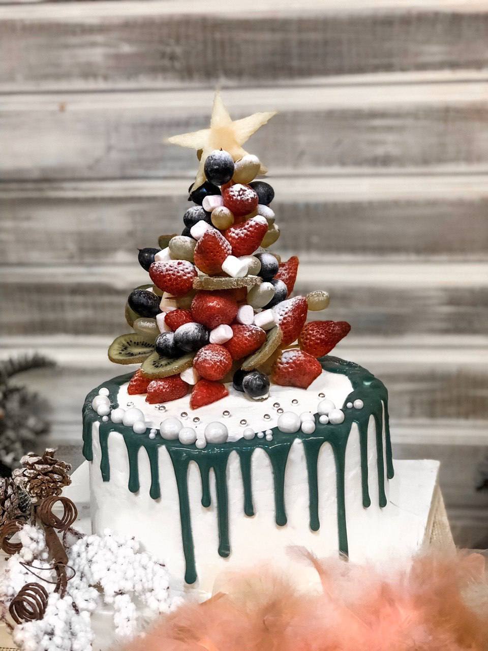 НОВОГОДНИЙ ШОКОЛАДНЫЙ ТОРТ С ФРУКТОВОЙ ЁЛОЧКОЙ И ГЛАЗУРЬЮ ИЗ ШОКОЛАДА