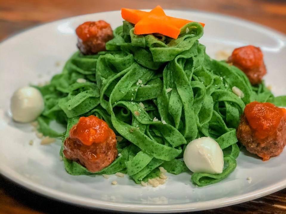 • Зелёная паста с тефтельками и томатным соусом