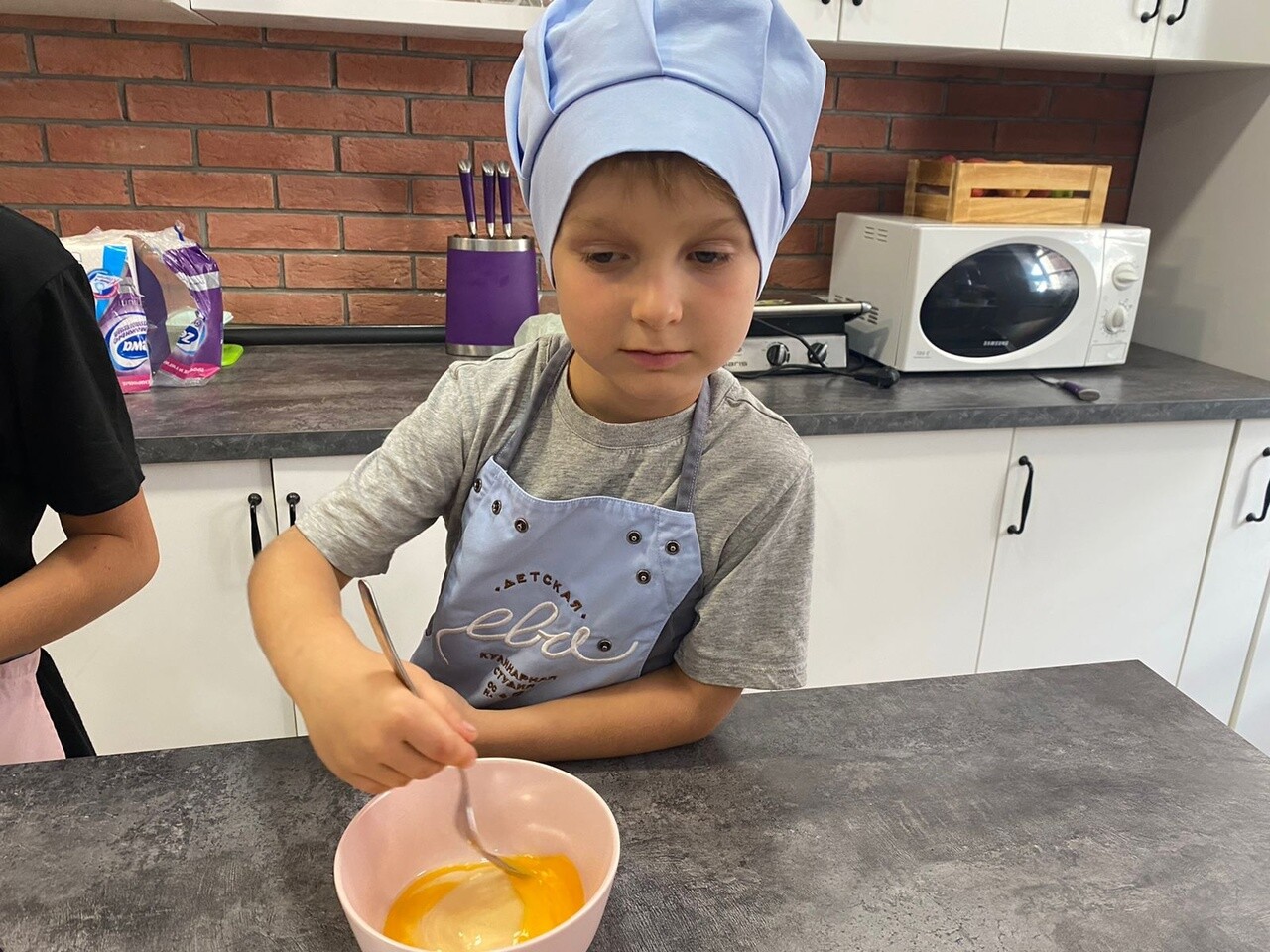 На мастер-классе дети знакомятся с кухонной техникой (учатся включать плиты и духовку, отмерять продукты, использовать кухонный инвентарь и оборудование)